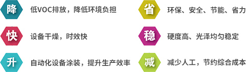 UV家具漆是一種高科技的環保涂料,大寶UV色漆系列符合美國ASTM F963和歐洲EN71parts 3的環保標準,無重金屬危害,具有超強的耐化學腐蝕和耐沾污性能。