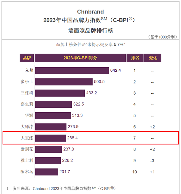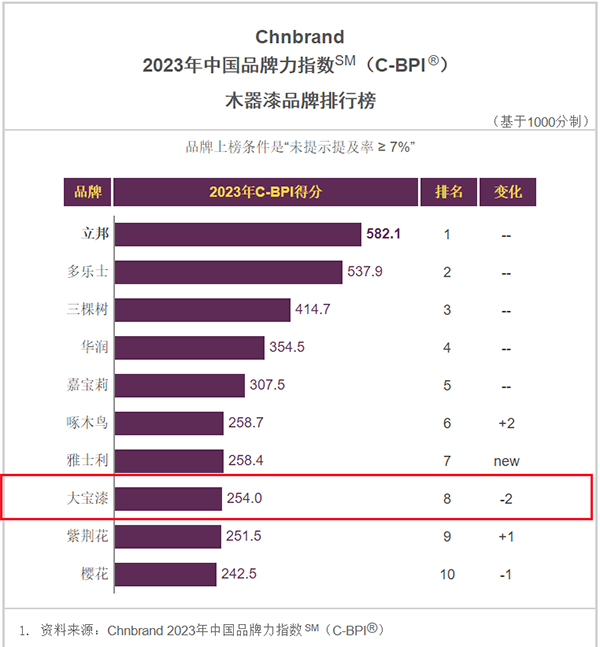 4月18日,品牌評級機構Chnbrand發(fā)布2023年第十三屆中國品牌力指數sm(C-BPI)品牌排名,大寶漆再度上榜“墻面漆品牌排行榜”、“木器漆品牌排行榜”雙榜單,彰顯品牌影響力。
