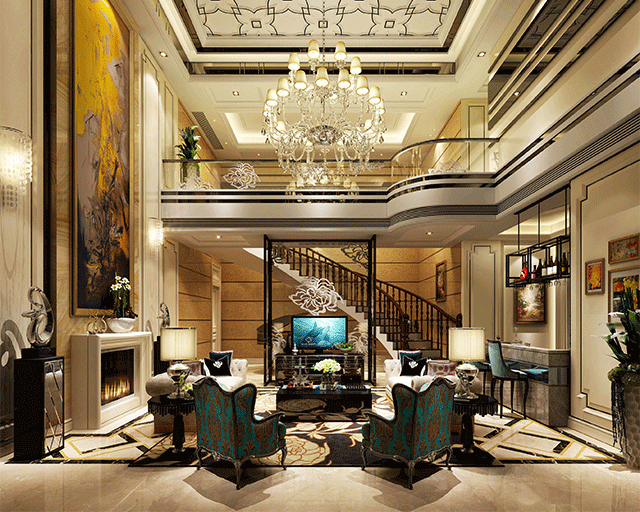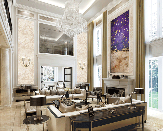 歐式客廳頂部喜用大型燈池,并用華麗的枝形吊燈營造氣氛。門窗上半部多做成圓弧形,并用帶有花紋的石膏線勾邊。室內(nèi)有真正的壁爐或假壁爐造型。墻面一般使用高檔藝術(shù)壁材,或優(yōu)質(zhì)環(huán)保的藝術(shù)涂料,如造型多樣的大寶L’opera樓貝進口藝術(shù)涂料,來烘托豪華效果。