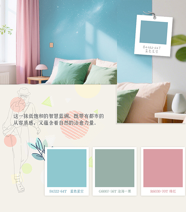 在春夏交替的時節(jié),色彩是最快改變空間氛圍的利器。2025年度大寶推薦色B4322-64T藍色星空,靈感來源于捕捉了破曉時分的澄澈與日暮時分的溫柔。淺藍的輕盈中糅入一絲綠意,如同晨光微熹時的天幕,又似暮色四合前的遠山。